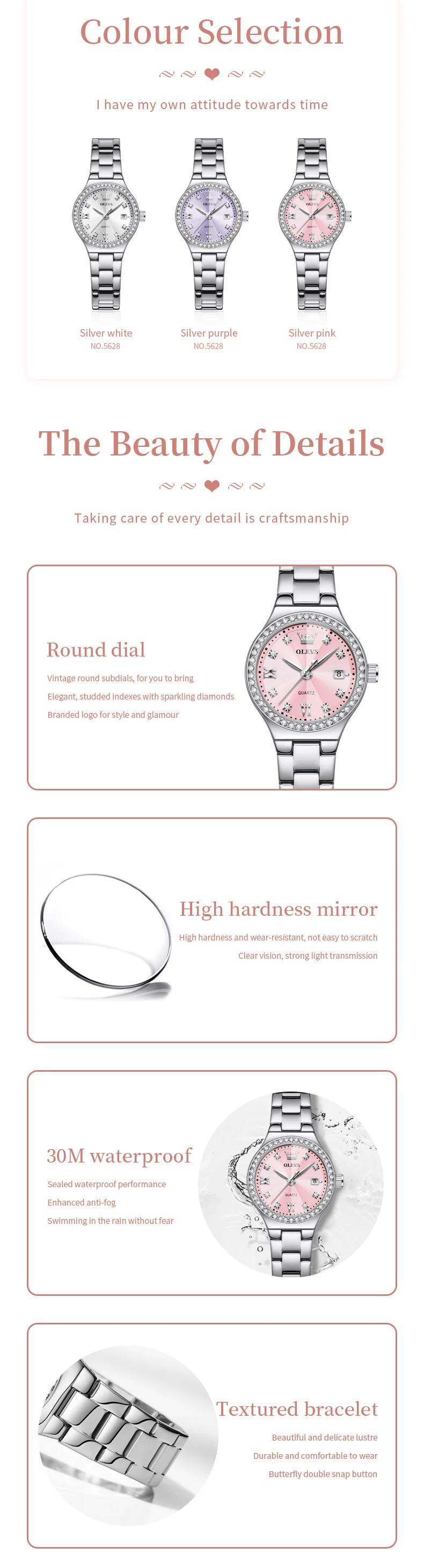 Realza tu estilo con este reloj OLEVS para mujer, una combinación perfecta de elegancia y funcionalidad. Su diseño moderno con detalles tipo diamante aporta un toque sofisticado, ideal para complementar tanto outfits casuales como formales.